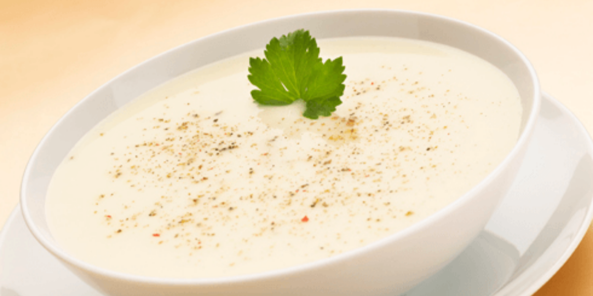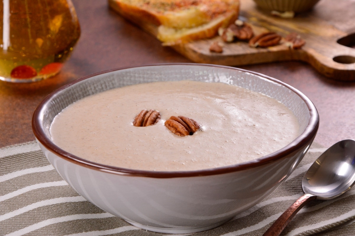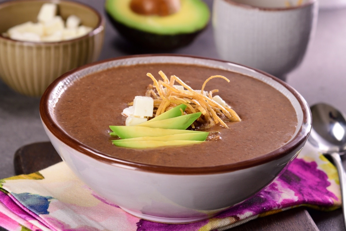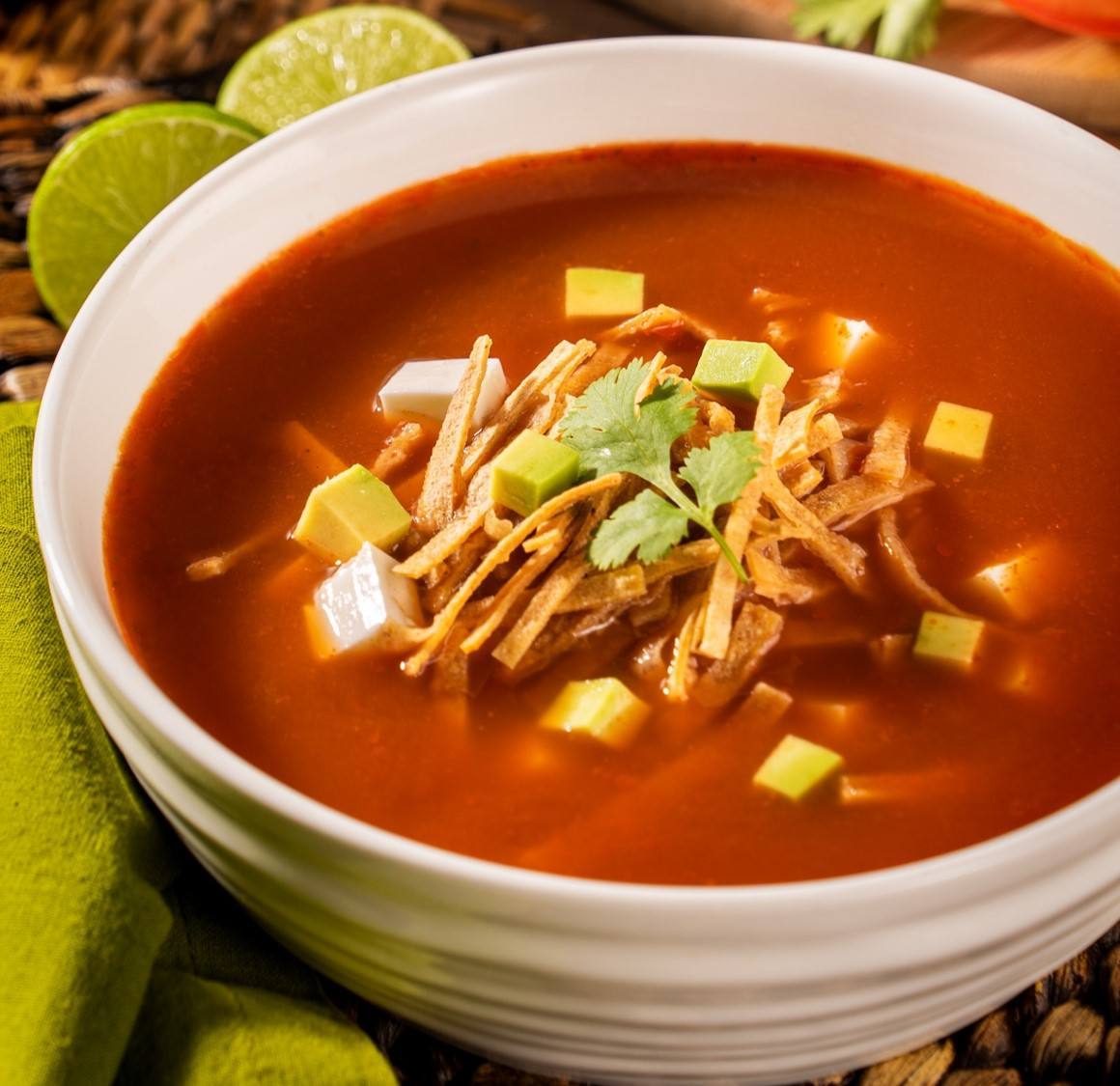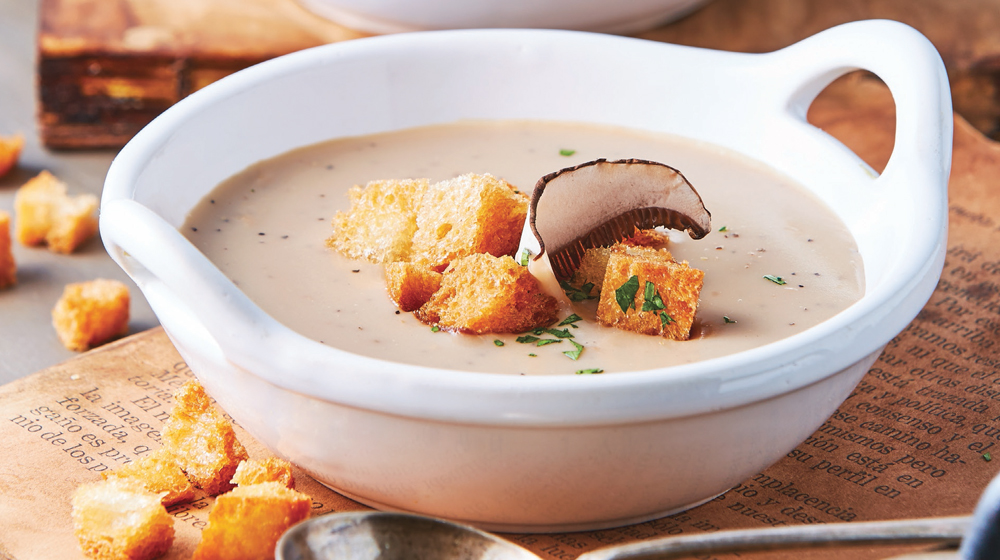 Sopa de hongos con rajas de chile poblano, granos de elote, queso amarillo, queso panela y un toque de crema